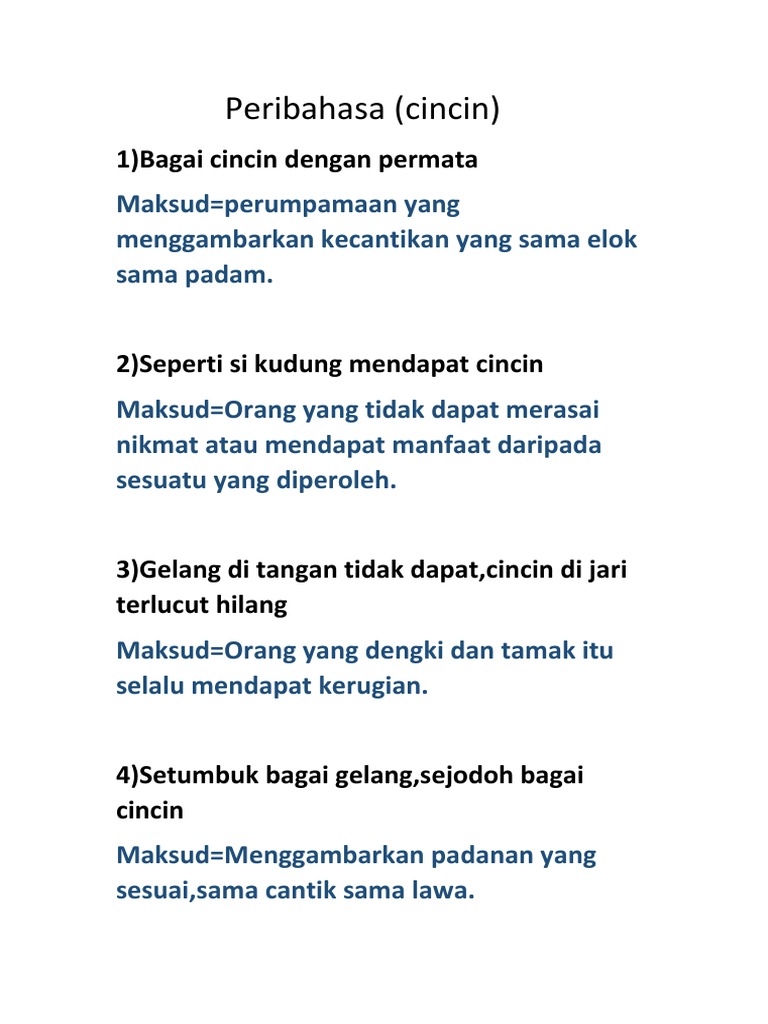 Maksud peribahasa bagai cincin dengan permata ialah pasangan lelaki dan perempuan yang sama cantik dan sama padan. Tegak sama tinggi duduk sama rendah 5. Maaf dipohon sebelum merana.